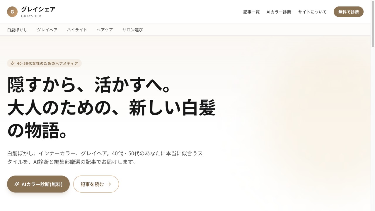 GraySher40代・50代女性のための白髪ぼかし・グレイヘア総合メディア。AIヘアカラー診断付き。