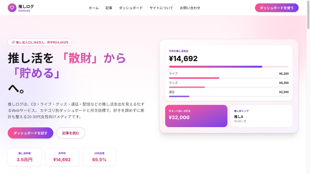 OshiLog推し活の支出を見える化して「貯める推し活」を叶えるメディア。支出管理ダッシュボード付き。