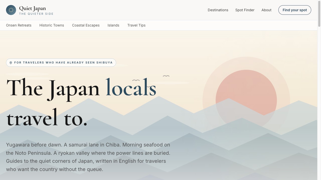 Quiet JapanA travel guide to quieter corners of Japan for foreign visitors. Onsen towns, castle towns, islands.