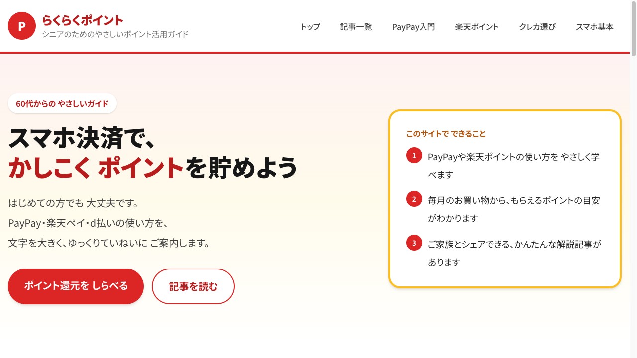 RakuRaku PointPayPay・楽天ペイ・d払いの使い方から、ポイントの貯め方まで。文字大きめ・ゆっくり解説。