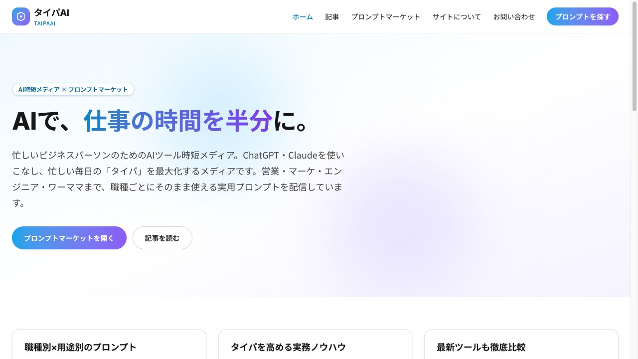 TaipaAI職種別に使えるChatGPT・Claudeの実用プロンプトとAI活用術を配信。プロンプトマーケット付き。